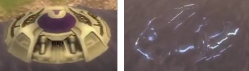 The Saucer briefly before cloaking (left), and the Saucer mid-cloak (right) in Destroy All Humans! 2