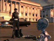 As Crypto battled Robo-Prez all across Capitol City in his Saucer with direction from Pox, Silhouette retreated from the Capitol Building in her Majestic car. After Crypto finally destroyed Robo-Prez and gloated in his victory, Pox reminded him that Silhouette was the real menace that they had to deal with. The both of them kept on mixing her up between a male and female as Pox tried to figure out where she disappeared to. Before Pox could finish his stumbling sentence, however, Silhouette herself contacted them both via radio transmission. She dared Crypto to come after her so they could fight one-on-one and said: "Sure you handled the boys: Armquist, Huffman. Oh, that was a 'challenge'. *Laughs* But everybody knows which sex is dominant on this planet!", which showed that she regarded Armquist and Huffman insignificantly in comparison to herself, the true Furon adversary.